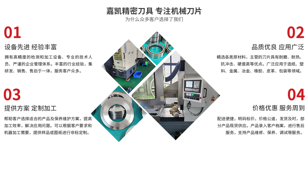 馬鞍山市嘉凱精密刀具科技有限公司主營各類機械刀片,產品銷往各大中型鋼廠、造紙、冶金、化工、紡織、電子、藥材、木工、園林、食品、橡膠輪胎廠,以及各種包裝行業。 我們致力于以產品質量贏得市場,崇尚質量至上的思想,制定了嚴格的質量把控措施,實行“質量買斷制”、“質量責任追究制”、和“產...